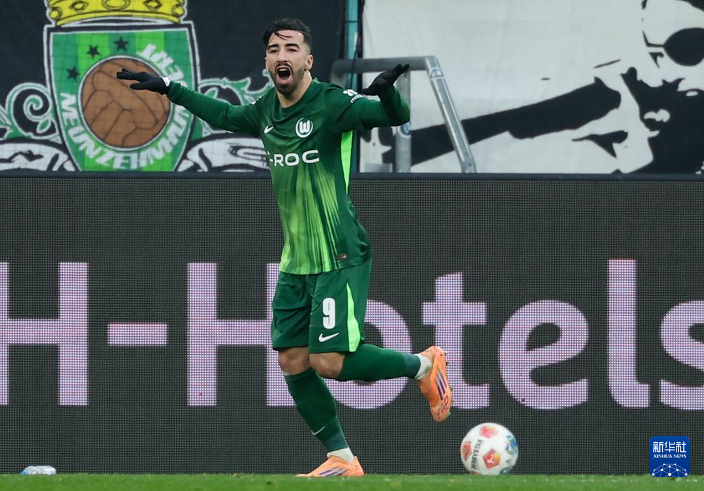 12月13日,沃尔夫斯堡队球员阿穆拉庆祝得分。