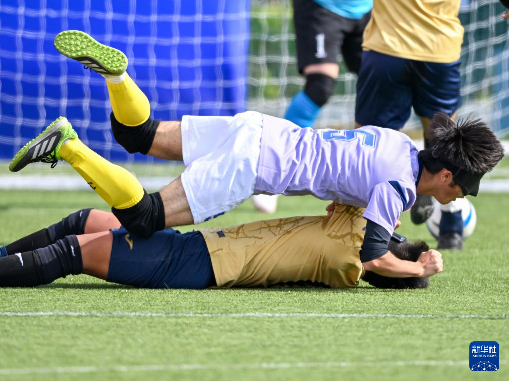 12月14日,天津队球员范海林(上)与广东二团队球员林显晴在拼抢时摔倒。
