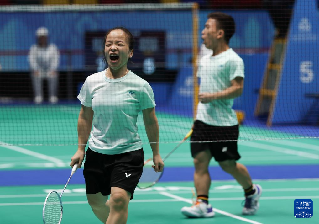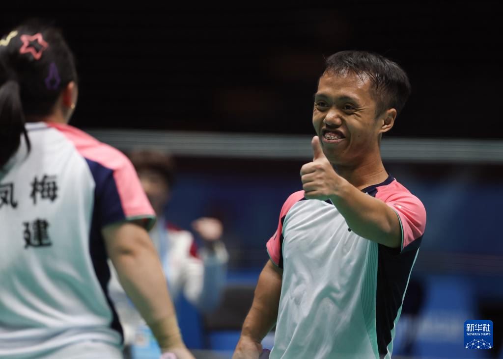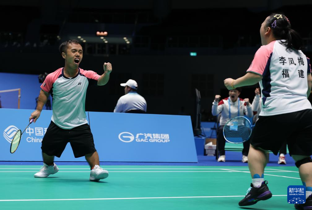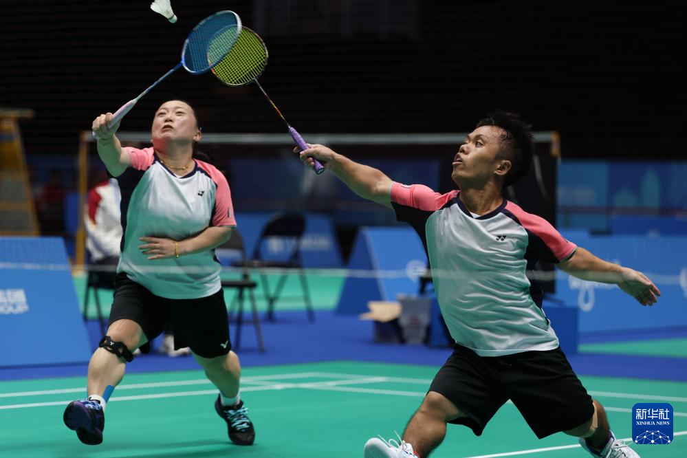 12月13日,福建队组合王鑫/翁卿(左)在SH6混合双打半决赛第1场比赛中。最终,他们2比1战胜广东一团队组合陈斌林/全梓华。