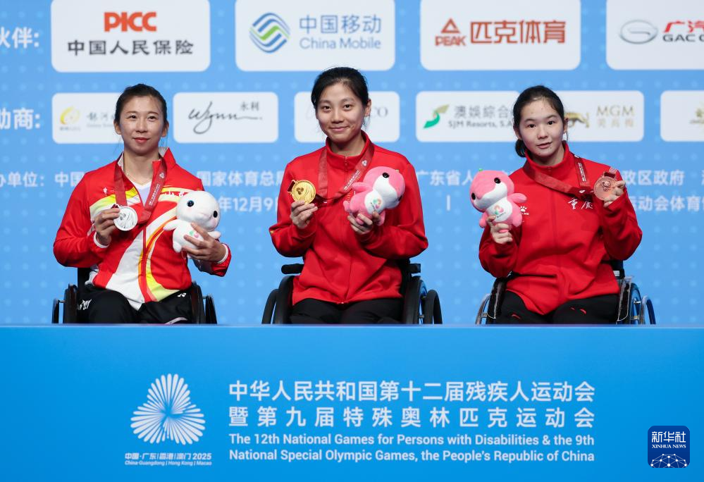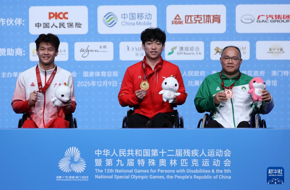12月13日,冠军河北队选手屈子墨(中)、亚军广东一团队选手曾信伟(左)、季军澳门一团队选手黄炳光在WH1男子单打颁奖仪式上。