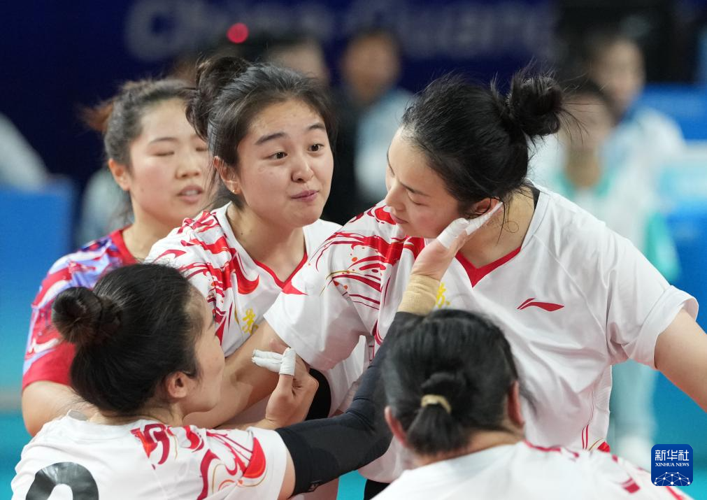 12月13日,江苏队球员唐雪梅(左)和队友陈慧(右)在比赛中相互鼓励。