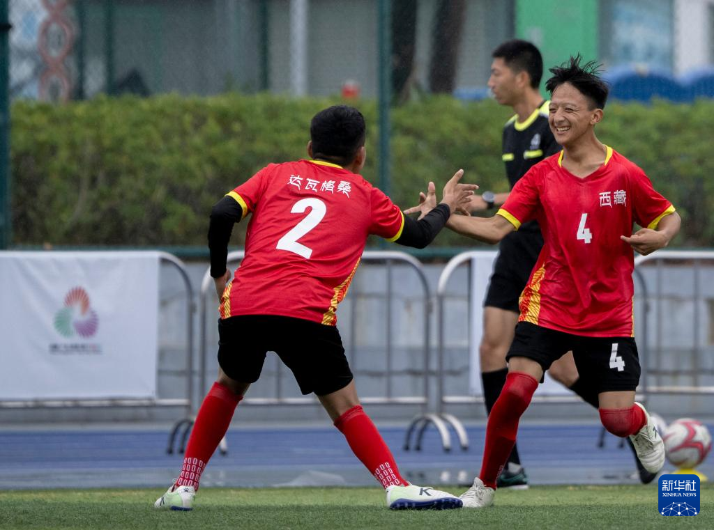 12月13日,西藏队球员达瓦格桑(左)、强巴松热在队制比赛决赛第二轮比赛中庆祝进球。最终 ,西藏队9比0战胜江西队。