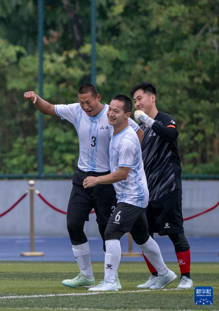 12月13日,山西队球员冯涛(左)、亢鑫(中)和杨子浩(右)在队制比赛决赛第二轮比赛中庆祝进球。最终,山西队6比0战胜黑龙江队。