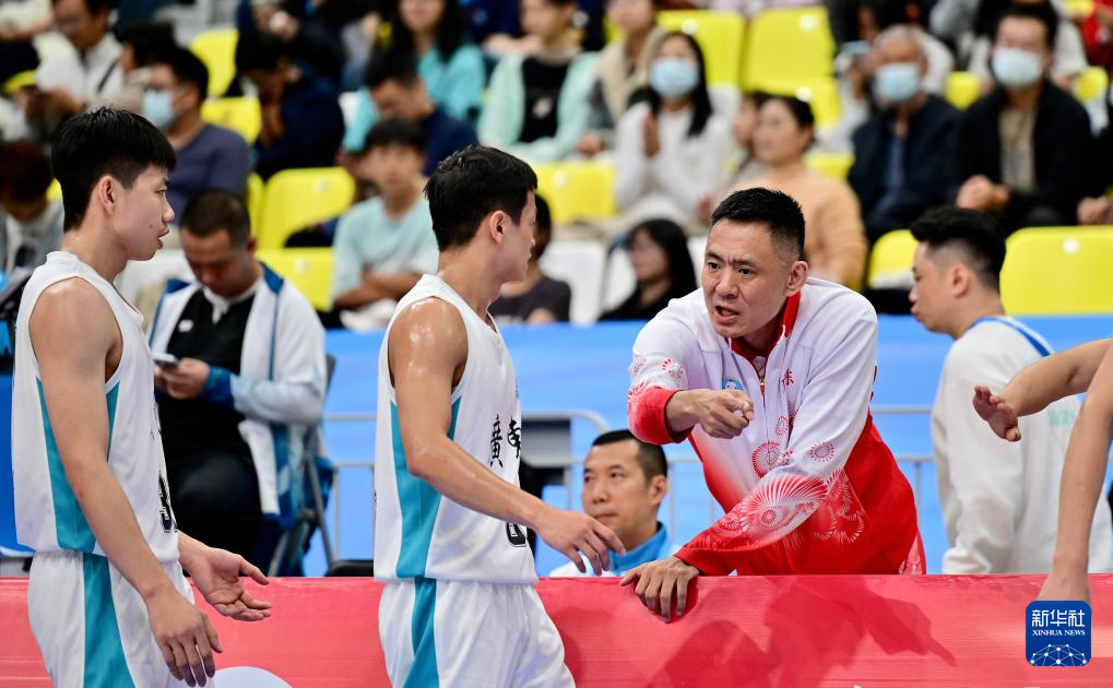12月13日,广东一团队教练李长洪(右二)在比赛间隙指导球员。