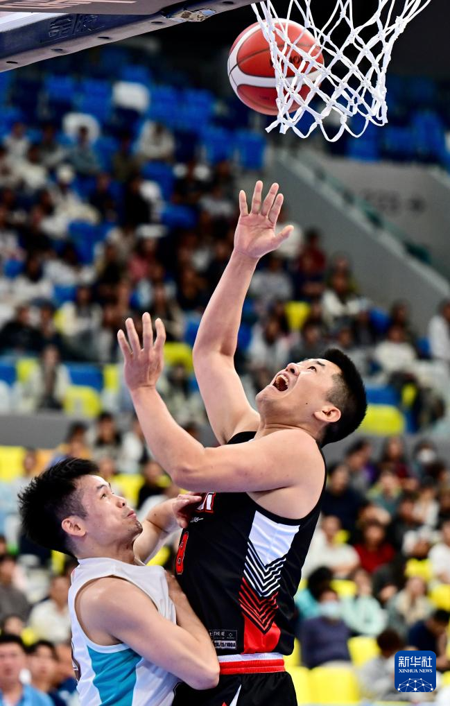 12月13日,广东一团队球员岳萌雷(右)在比赛中上篮。