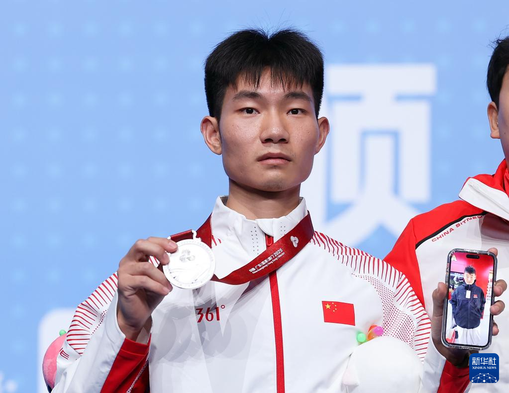 12月14日,冠军内蒙古队组合张博(中)/贾槐宇(左二)、亚军湖北队选手宋绍阳(左一)和季军福建队组合冯国忠(右一)/冯天宇(右二)在颁奖仪式上。因搭档丁奕博受伤,宋绍阳用手机展示其照片。