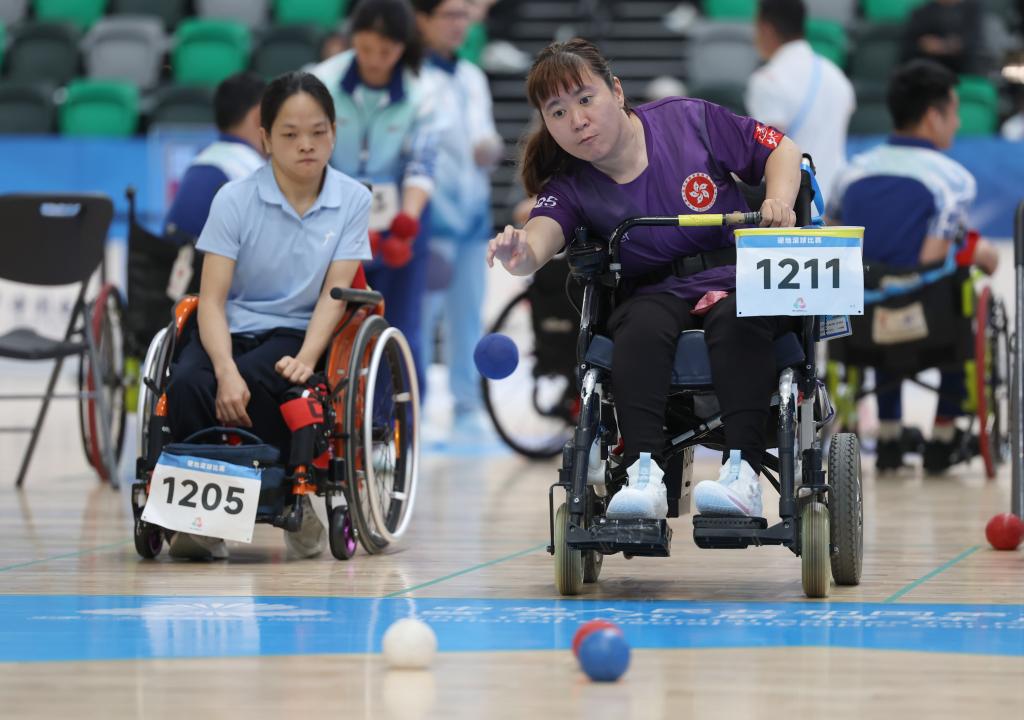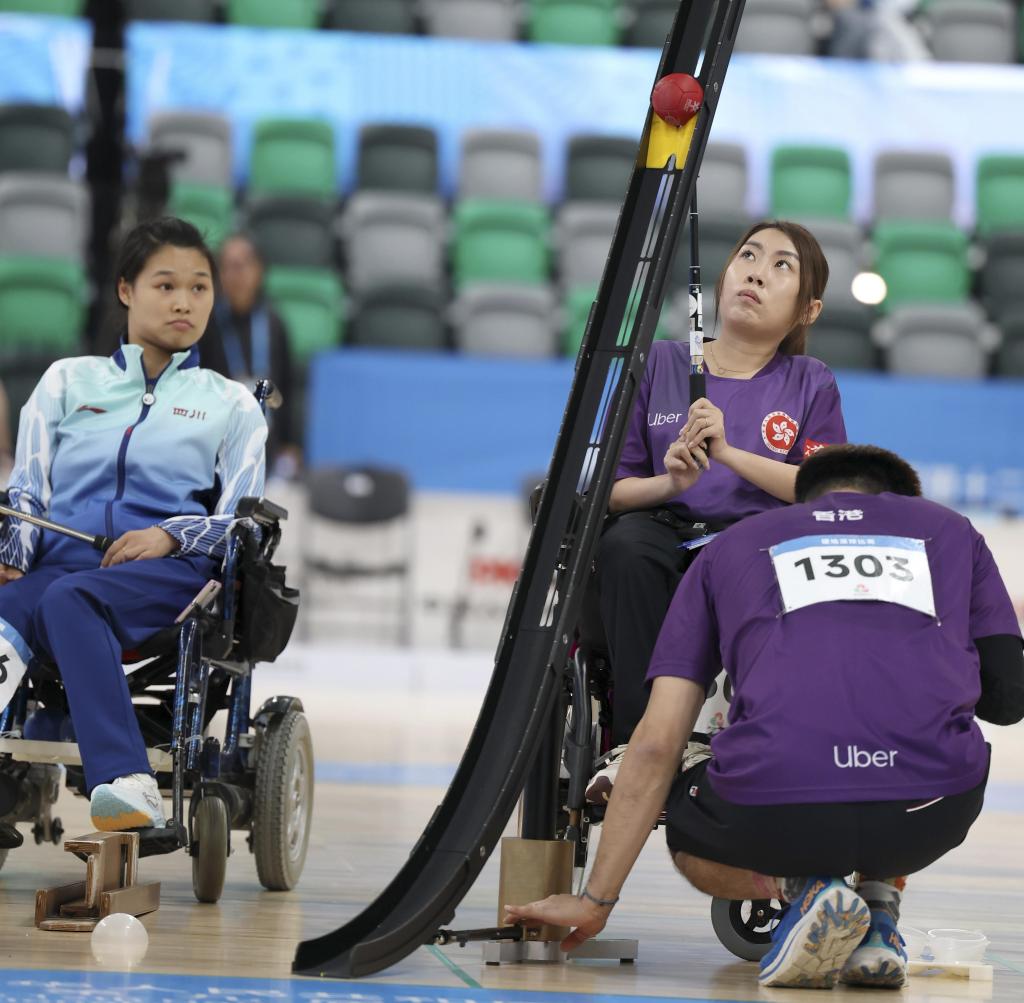 香港硬地滚球队BC2级运动员郭海莹在本届残特奥会上争金夺银之时,她的父母也在忙碌着——父亲在场边为香港运动员运筹帷幄,他是香港硬地滚球队教练;母亲则在场内全神贯注,她是一名硬地滚球国际级裁判。