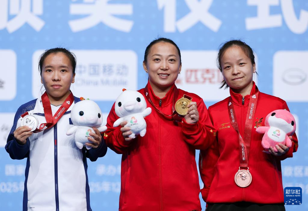 12月14日,福建队选手李凤梅(中)、浙江队选手林双宝(左)和福建队选手翁卿在颁奖仪式上。