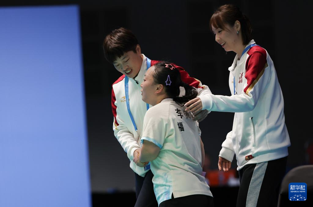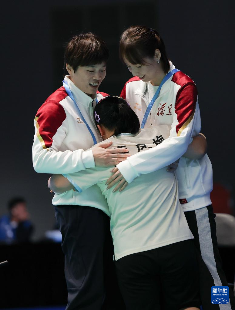 12月14日,福建队选手李凤梅(中)在比赛后与教练团队庆祝胜利。