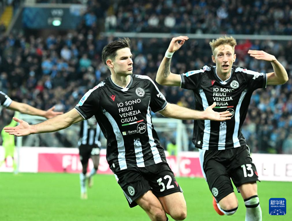 12月14日,乌迪内斯队球员埃克伦坎普(左)庆祝进球。