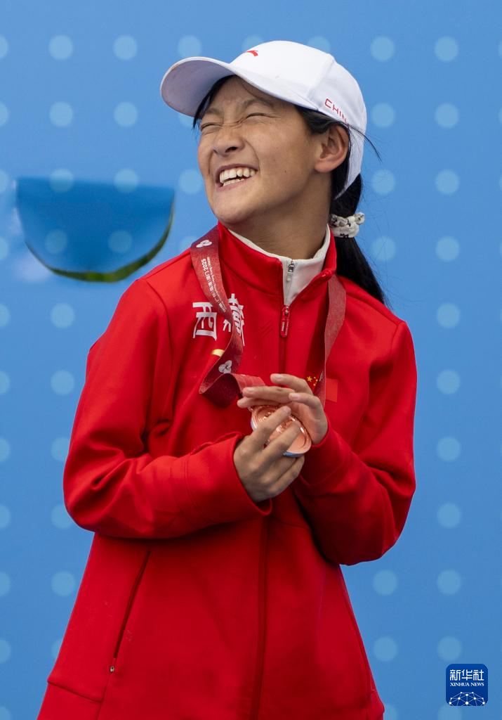 12月15日,西藏队选手次旦拉措在颁奖仪式上庆祝。她获得特奥足球个人技术比赛C组季军。