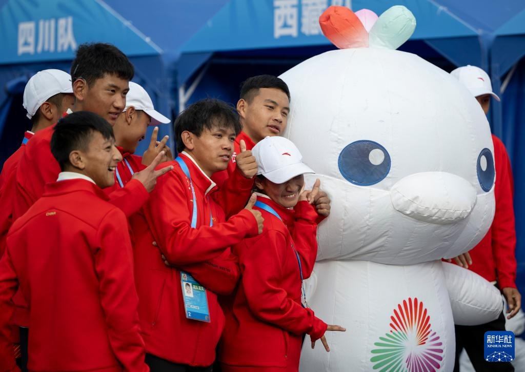 12月15日,西藏队在颁奖仪式开始前与吉祥物“喜洋洋”合影。西藏队获得特奥足球队制比赛C组冠军。
