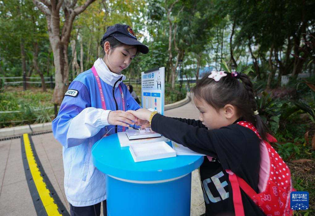 12月14日,香港高中生义工叶钰莹(左)为小朋友盖纪念章。叶钰莹就读于香港荃湾区的一所高中,前来义工服务点单程通勤就要一个多小时,收工后还得赶去上补习班。即便如此,她依旧愿意挤出时间参与义工服务。在互动区里,她负责为观众盖纪念章,每当收到观众的感谢与赞许,小姑娘的脸上总会露出会心的笑容。“老师鼓励我们多和社会建立连接,我也从义工服务中收获了温暖与能量,这是书本里学不到的东西。”