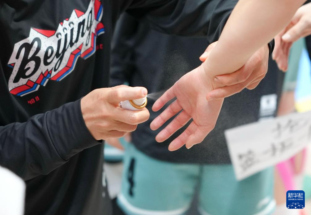 12月15日,北京队球员李海霞(左)为队友张静喷雾止痛。