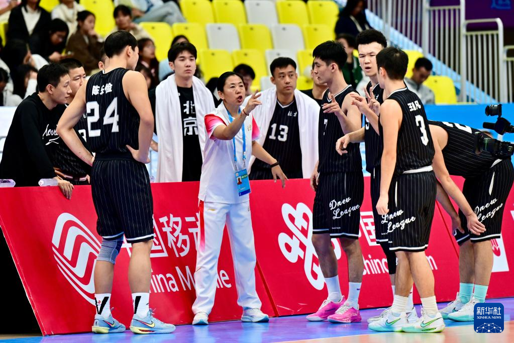 12月15日,北京队教练陈晓莹(中)在比赛间隙用手语向球员布置战术。