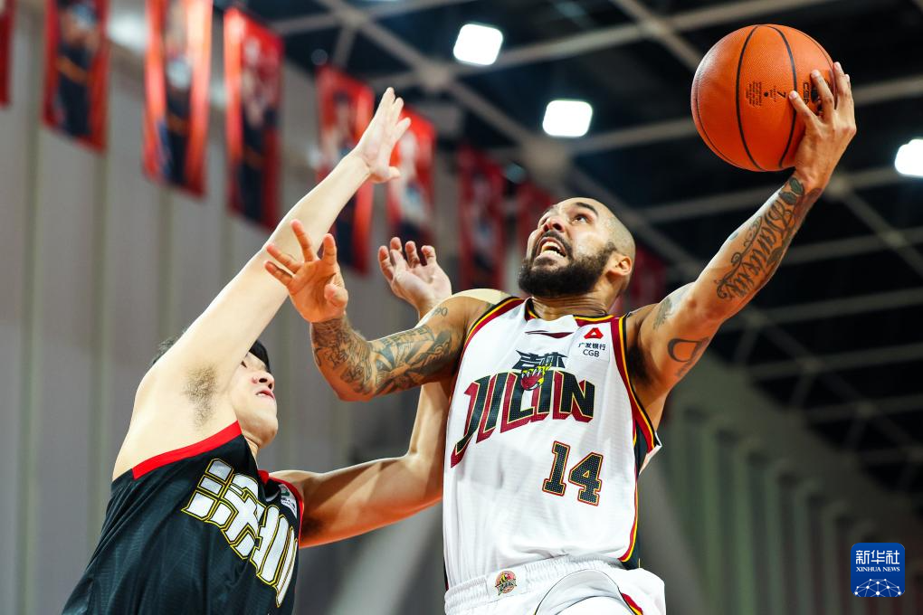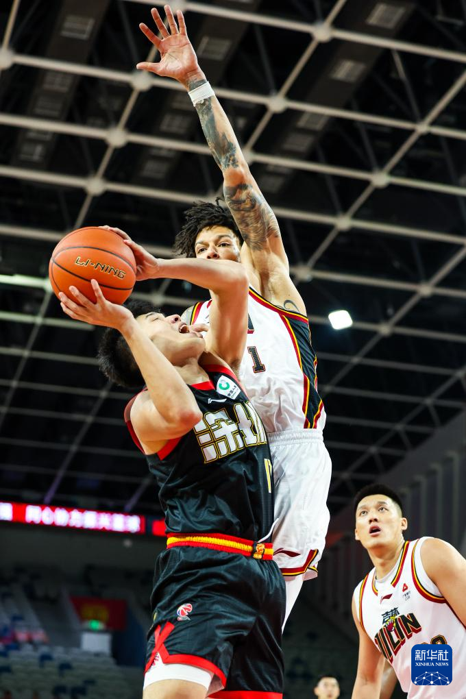 12月16日,吉林长白山恩都里队球员摩尔(右)在比赛中突破上篮。