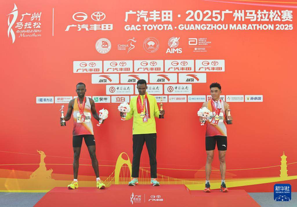 12月21日,冠军埃塞俄比亚选手阿费沃克·梅斯芬·沃尔德腾萨耶(中)、亚军肯尼亚选手菲利克斯·基普图·科瓦(左)和季军中国选手扎西次仁在男子组颁奖仪式上。