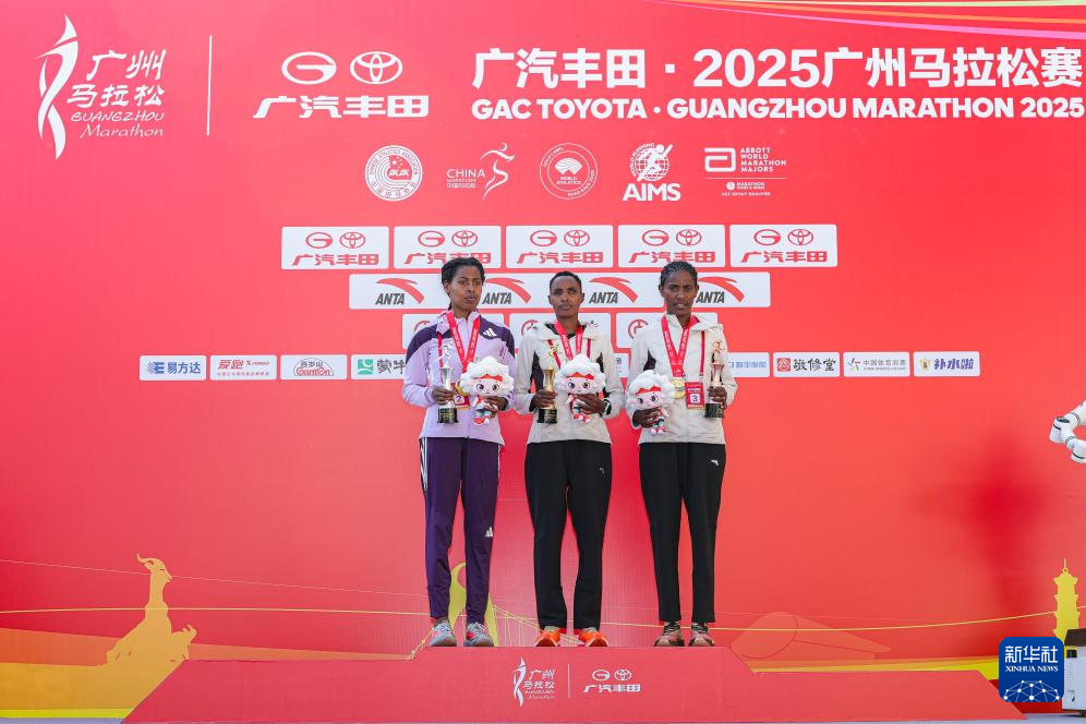 12月21日,冠军埃塞俄比亚选手泰莱(中)、亚军埃塞俄比亚选手耶梅尔(左)、季军埃塞俄比亚选手库姆萨在女子组颁奖仪式上。