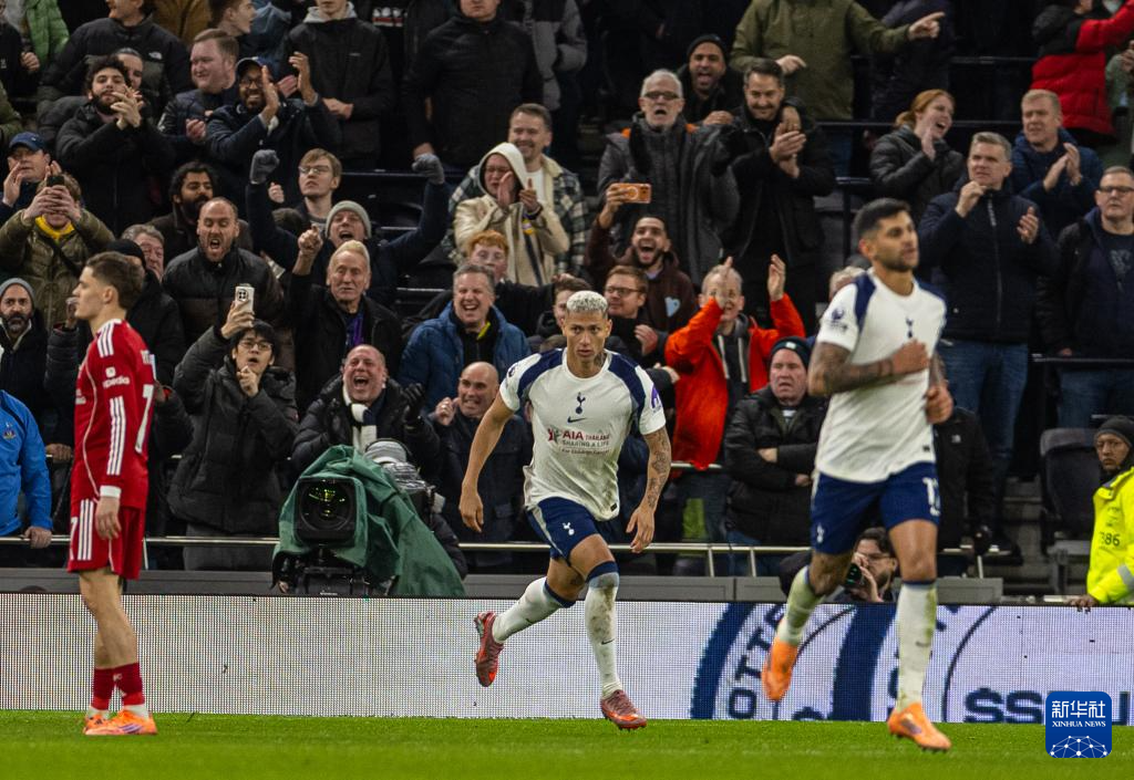 12月20日,热刺队球员里沙利松(右三)在比赛中破门。