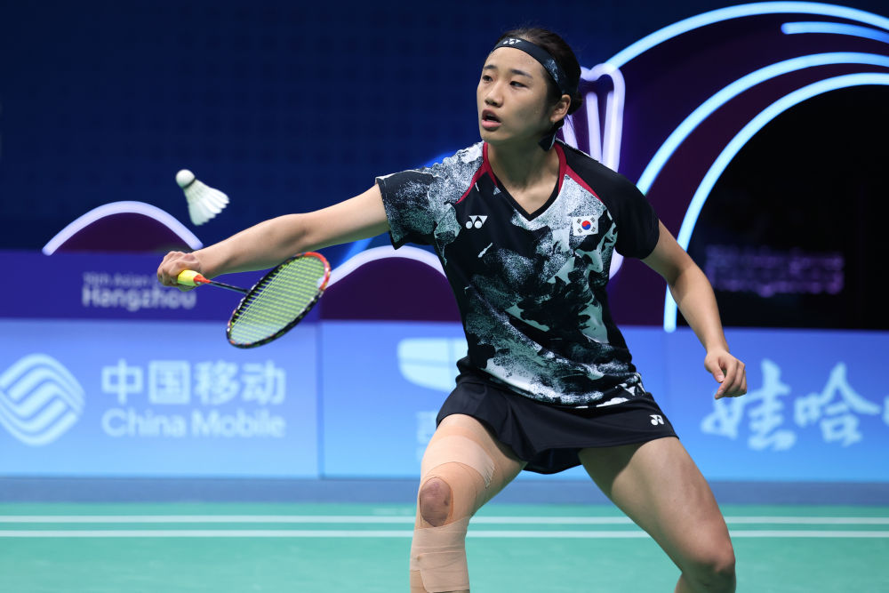 2023年10月7日,在杭州亚运会羽毛球女子单打决赛中,安洗莹以2:1战胜陈雨菲,获得冠军,图为韩国选手安洗莹在比赛中。新华社记者 陈斌 摄