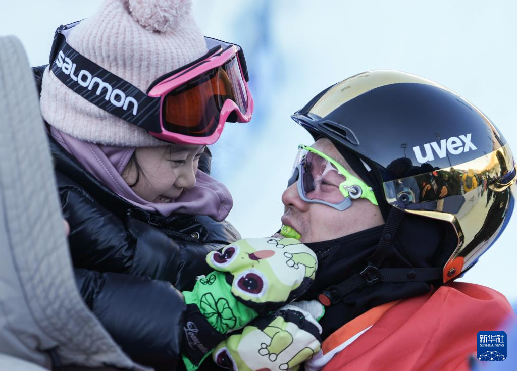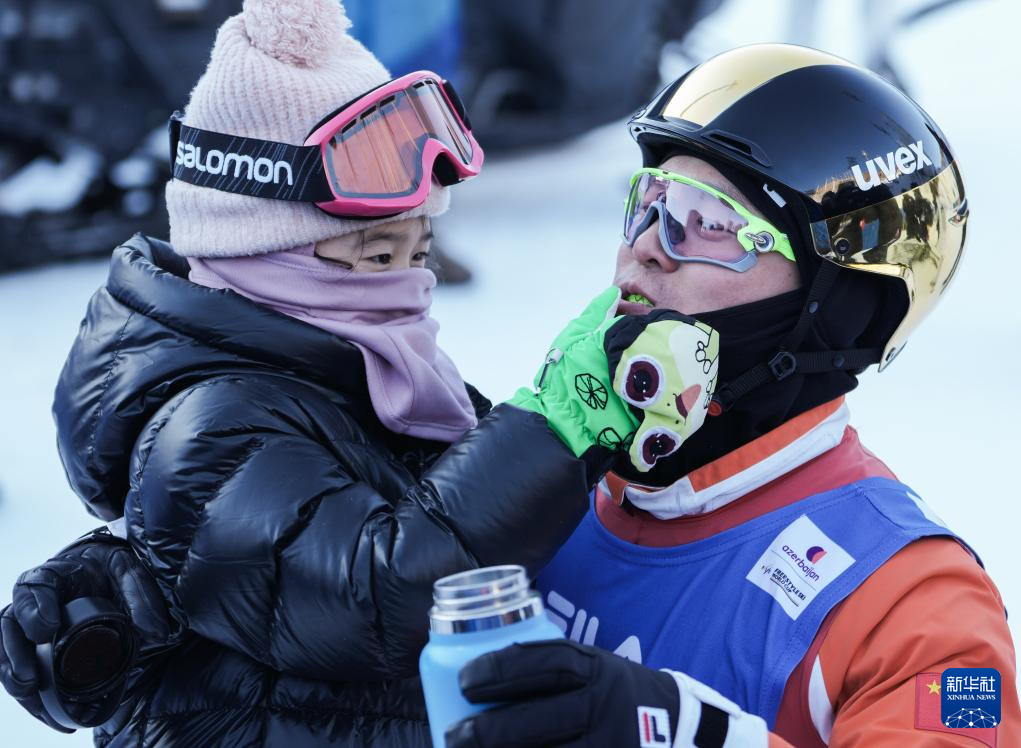 12月20日,中国自由式滑雪运动员齐广璞(右)的女儿在赛后为他摘下护脸。最终,齐广璞获得男子个人项目银牌。