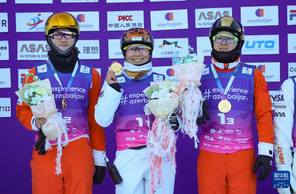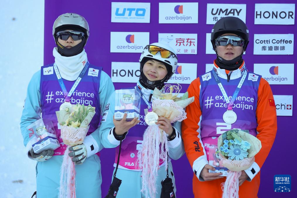 12月21日,冠军中国一队选手徐梦桃(中)、李天马(左)和齐广璞在颁奖仪式上。