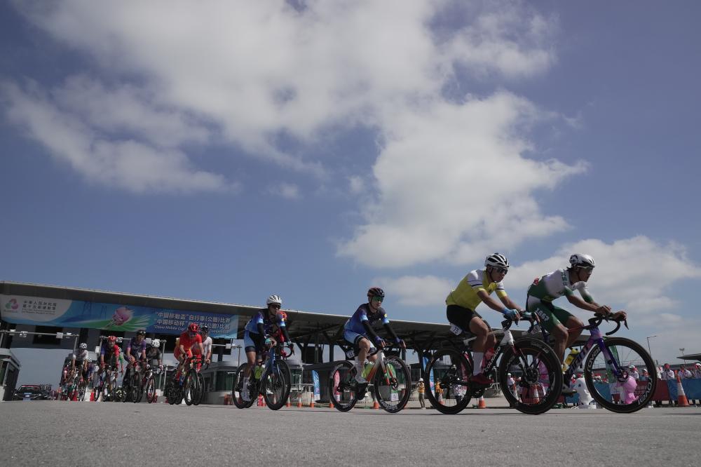 11月8日,第十五届全国运动会公路自行车男子个人赛决赛参赛选手经过港珠澳大桥香港口岸车辆通关广场。新华社发(吕小炜摄)