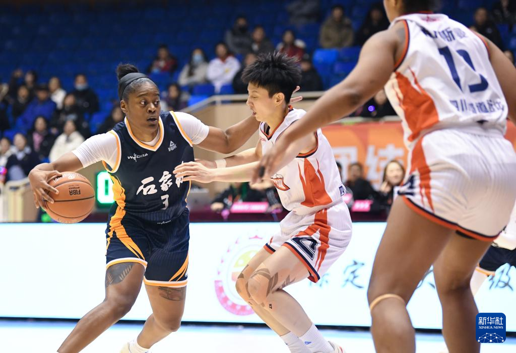 12月22日,石家庄英励队球员凯拉·戴维斯(左一)在比赛中带球突破。
