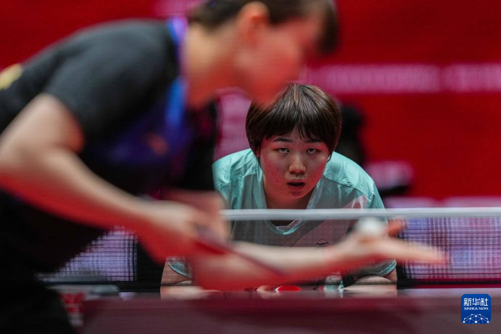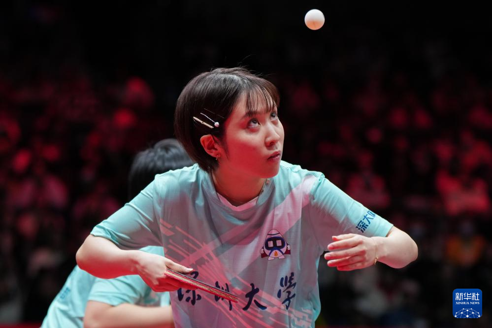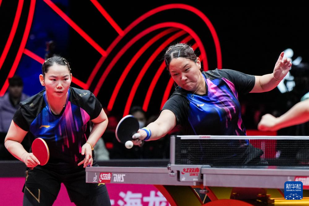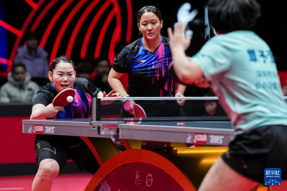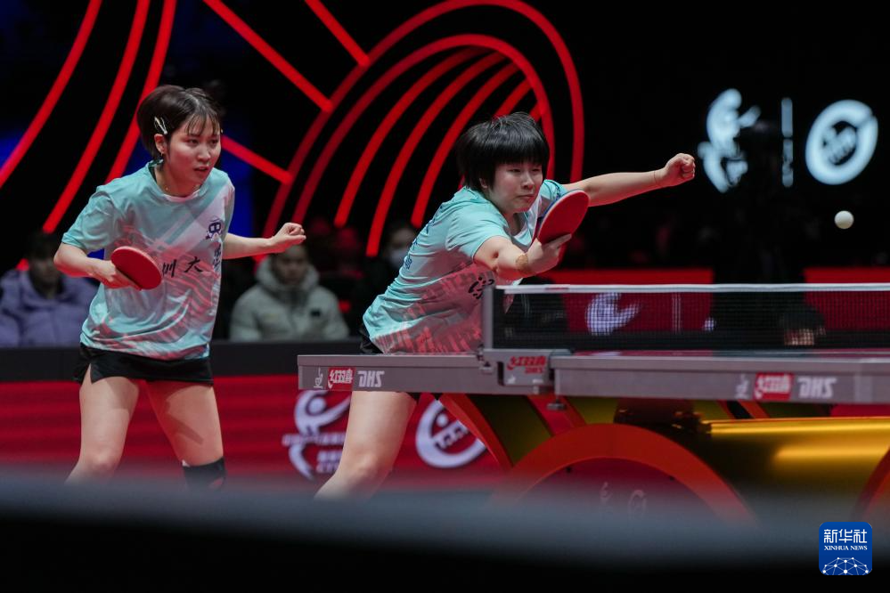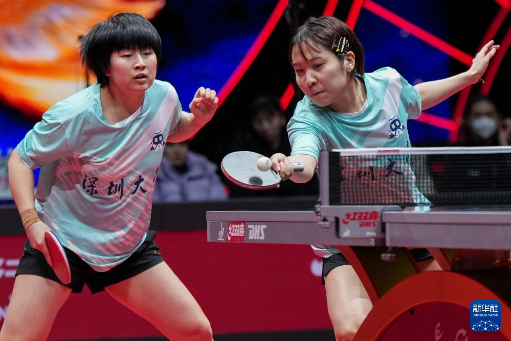 12月26日,深圳大学队组合覃予萱/平野美宇(前)在女双比赛中。她们3比2战胜上海龙腾队组合孙铭阳/何卓佳。