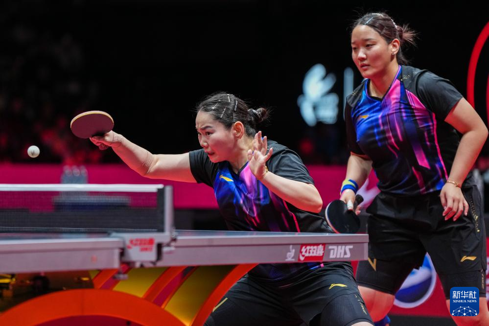 12月26日,深圳大学队组合覃予萱(右)/平野美宇在女双比赛中。她们3比2战胜上海龙腾队组合孙铭阳/何卓佳。