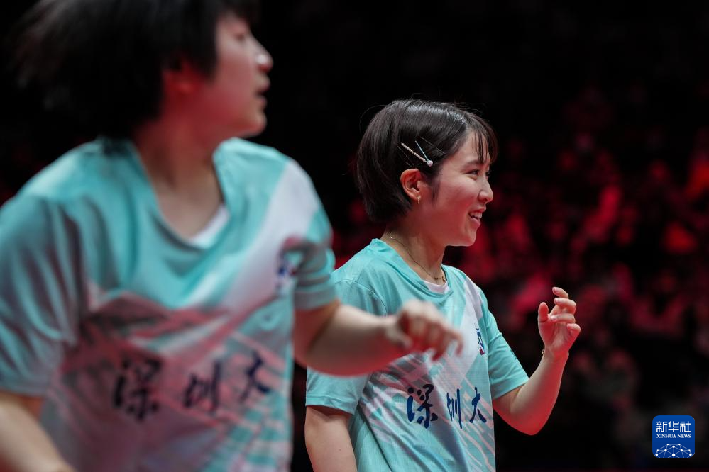 12月26日,深圳大学队组合覃予萱/平野美宇(右)在女双比赛中庆祝得分。她们3比2战胜上海龙腾队组合孙铭阳/何卓佳。