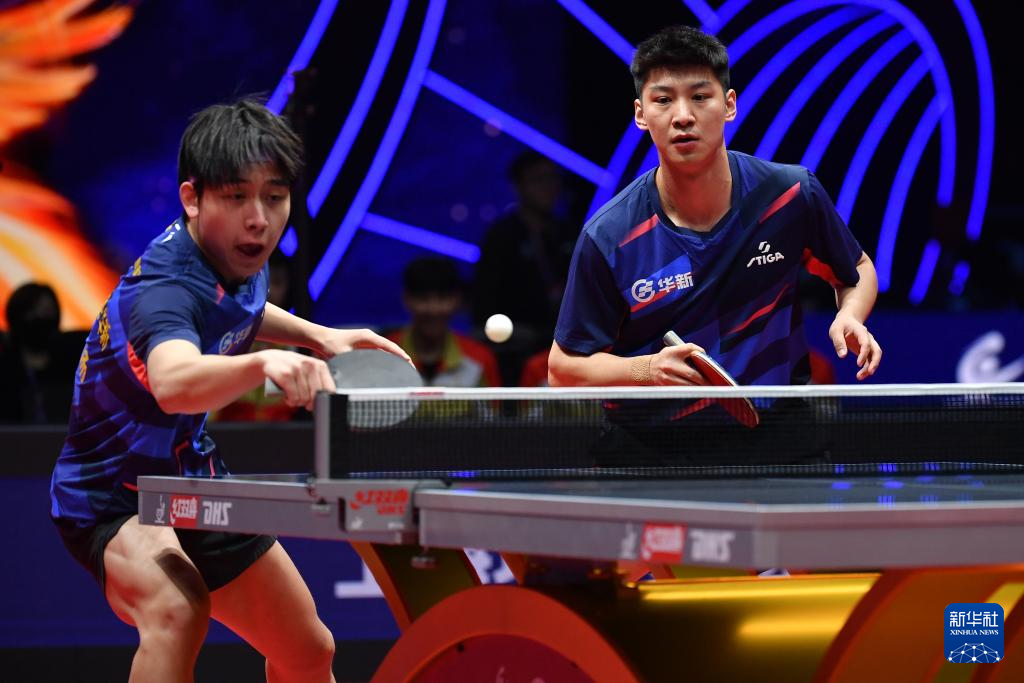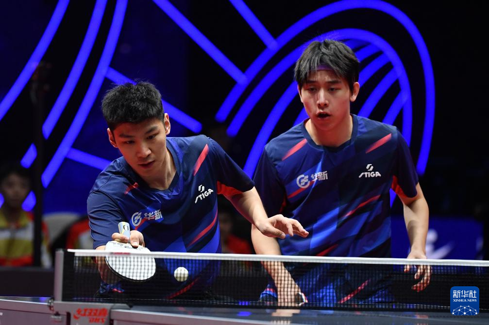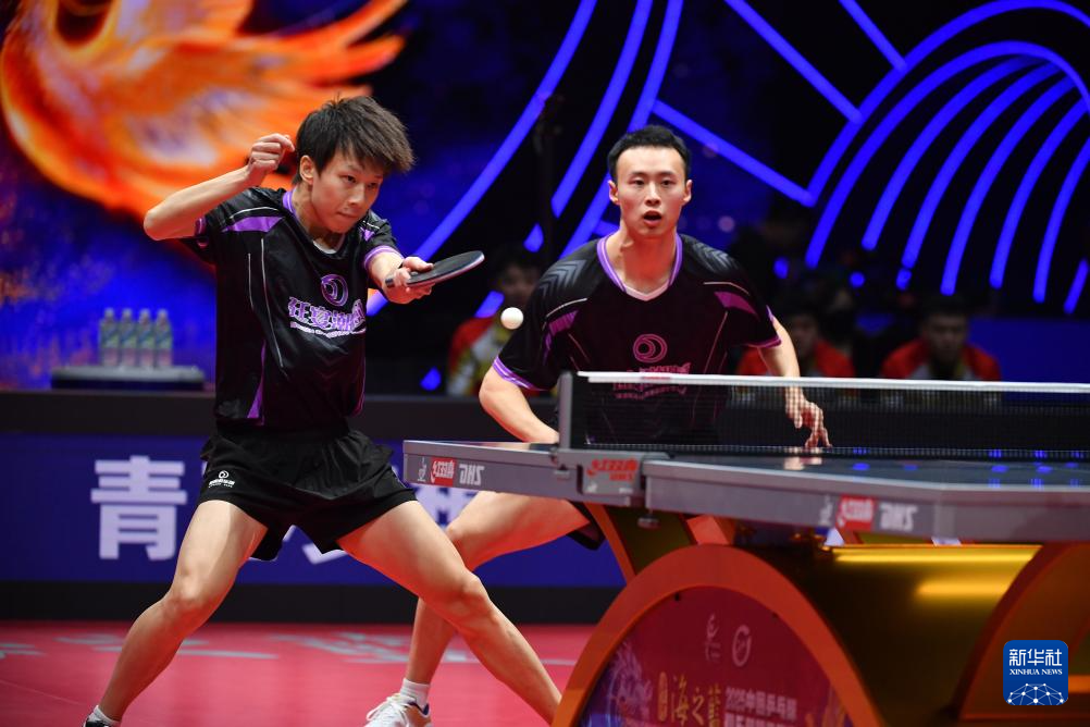 12月27日,汕头明润队组合徐海东/林高远(左)在双打比赛中。他们3比0战胜黄石基地·华新队组合薛飞/胡畅。