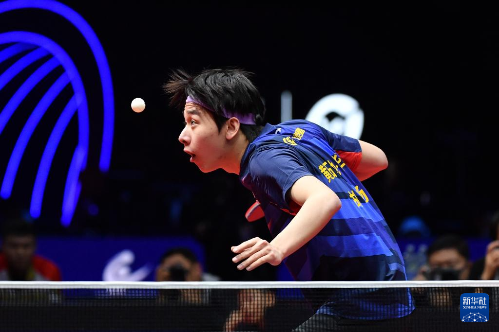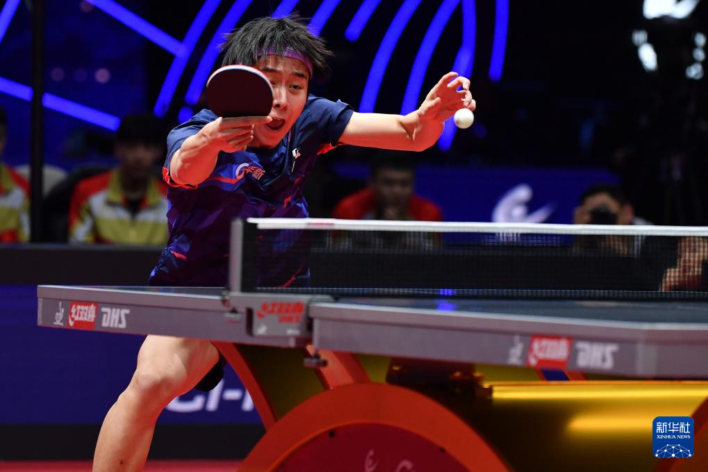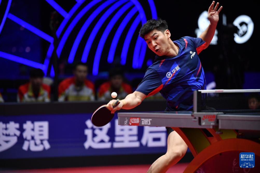 12月27日,黄石基地·华新队选手薛飞在单打比赛中回球。他3比1战胜汕头明润队选手陈垣宇。