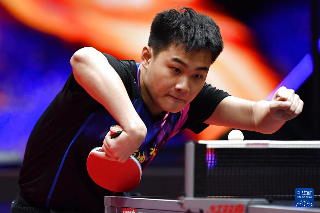 12月27日,山东魏桥·向尚运动队选手王楚钦在单打比赛中发球。他3比0战胜上海地产集团队选手赵子豪。