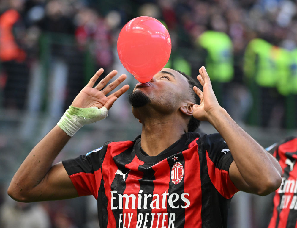 12月28日,AC米兰队球员恩昆库庆祝个人本场第一粒进球。新华社发(阿尔贝托·林格利亚 摄)