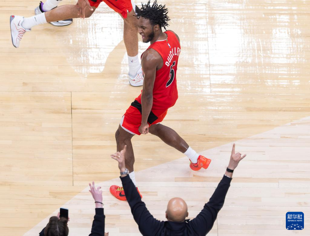 12月28日,猛龙队球员奎克利在比赛中庆祝命中三分球。