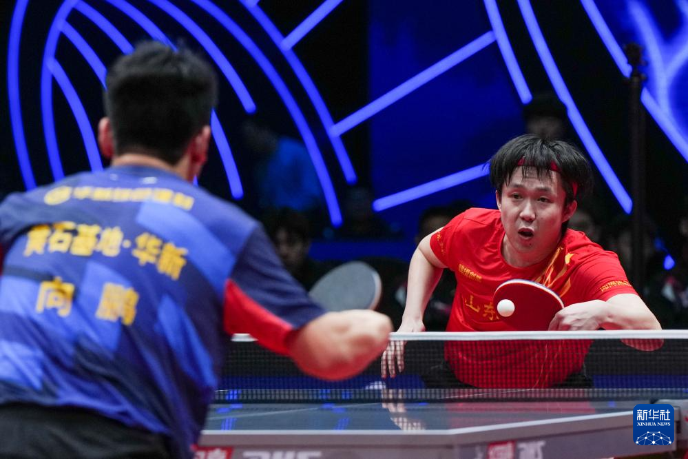 12月28日,山东魏桥·向尚运动队选手王楚钦(右)在单打比赛中回球。他3比1战胜黄石华新队选手向鹏。