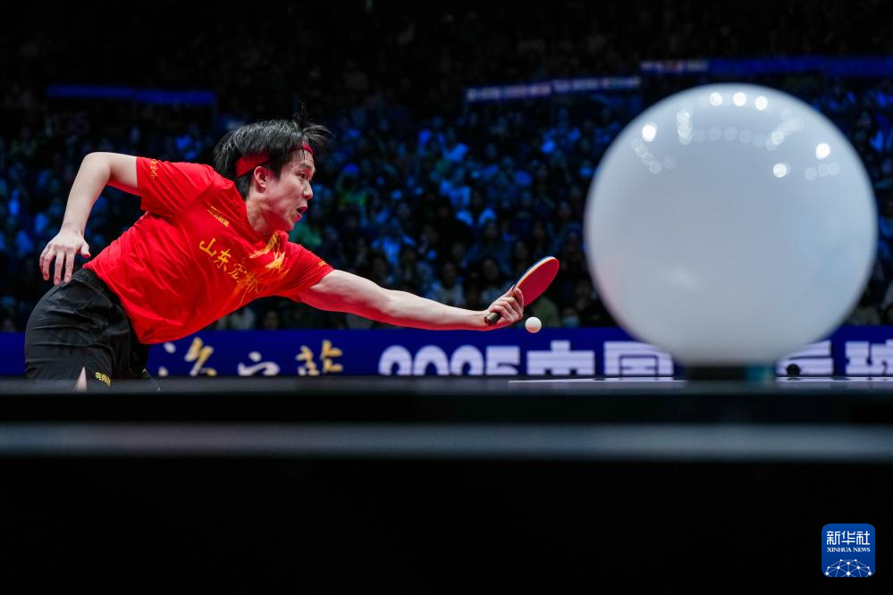 12月28日,山东魏桥·向尚运动队选手王楚钦在单打比赛中回球。他3比1战胜黄石华新队选手向鹏。
