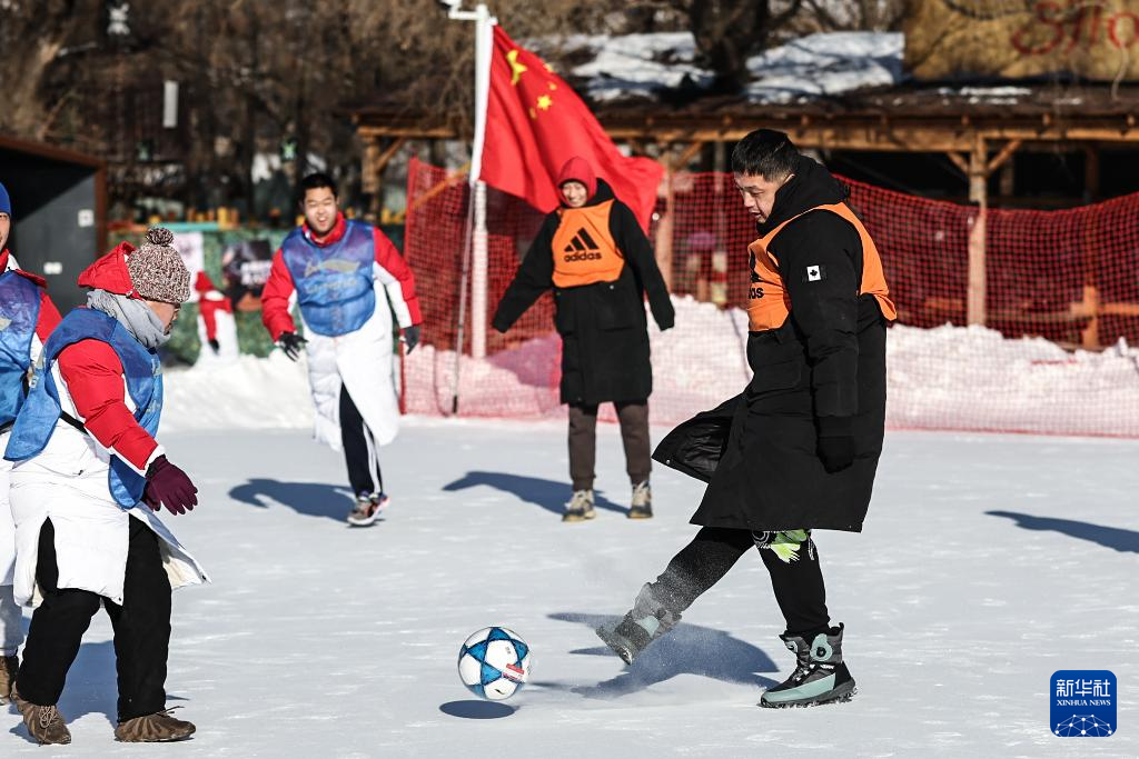 12月30日,与会人员在启动仪式中进行雪地足球比赛。