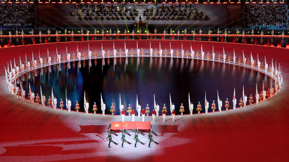 中华人民共和国运动会会旗、中华人民共和国第十五届运动会会旗入场。[ 2025-11-09 20:04:49 ]