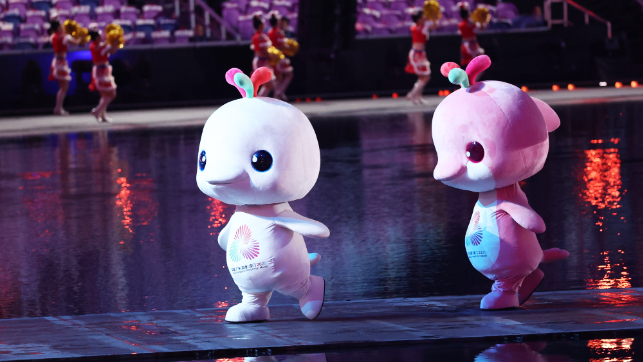 第十五届全运会吉祥物“喜洋洋”、“乐融融”欢乐相伴,身着极具岭南风韵广绣服装的引导员,手持彰显中华传统文化雅和之美团扇造型的引导牌,引领代表团入场。[ 2025-11-09 20:08:38 ]