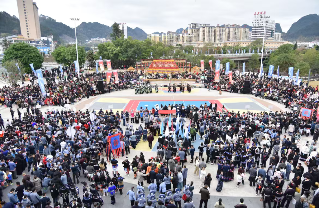 当天揭幕战之前举行了民俗文化大巡游,荔波县数千名少数民族群众盛装出行,银饰叮当、衣袂飞扬,组成一个个创意十足的方阵,队员们或手捧各村的农特产品,或拿着铜鼓、芦笙、蜡画、陀螺等非遗手工艺品,让“村排”赛场变身民族文化秀场,通过直播将贵州乡土特色呈现给全国观众。