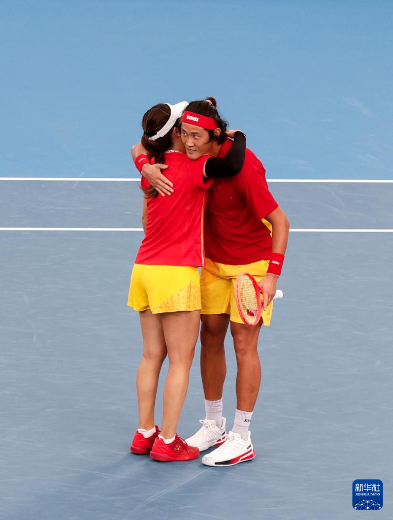 1月3日,中国队选手朱琳(左)/张之臻在混双比赛后庆祝。他们与比利时队组合梅尔滕斯/贝格斯战成1比1后,通过“抢十”大战获得胜利。