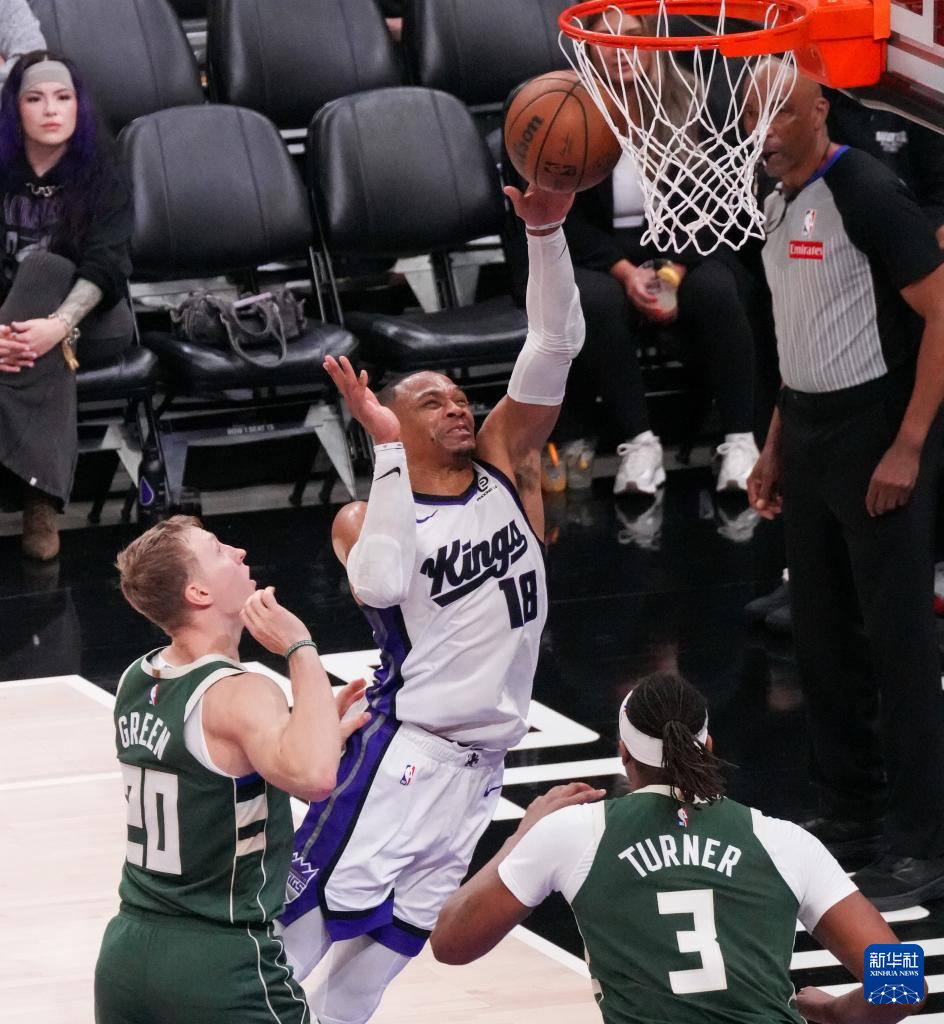 1月4日,国王队球员拉塞尔·威斯布鲁克(中)在比赛中上篮。