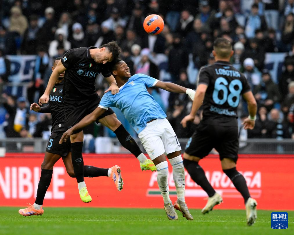 1月4日,那不勒斯队球员拉赫玛尼(左上)与拉齐奥队球员诺斯林(中)在比赛中争顶。