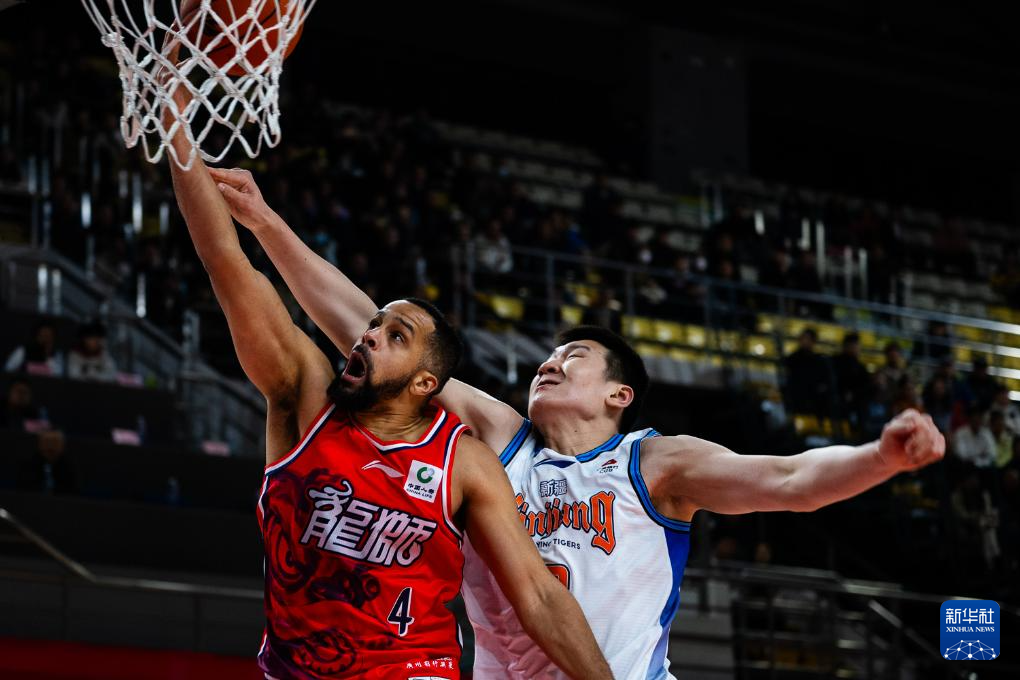1月6日,广州朗肽海本队球员托马斯(左)在比赛中上篮。