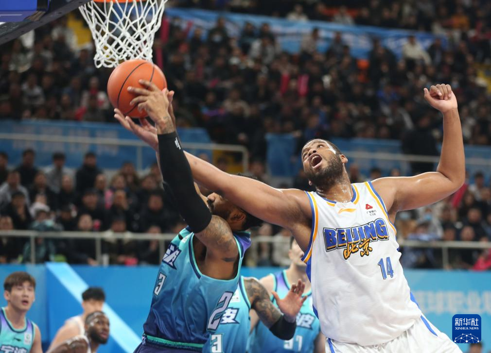1月6日,北京北汽队球员斯佩尔曼(右)在比赛中拼抢篮板球。