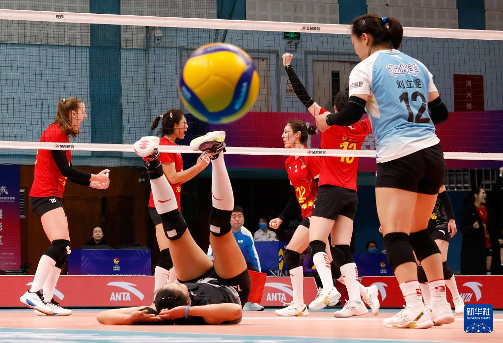 1月6日,北京北冰洋队球员邹佳祺(中)、单琳倩(右)在比赛中双人拦网。