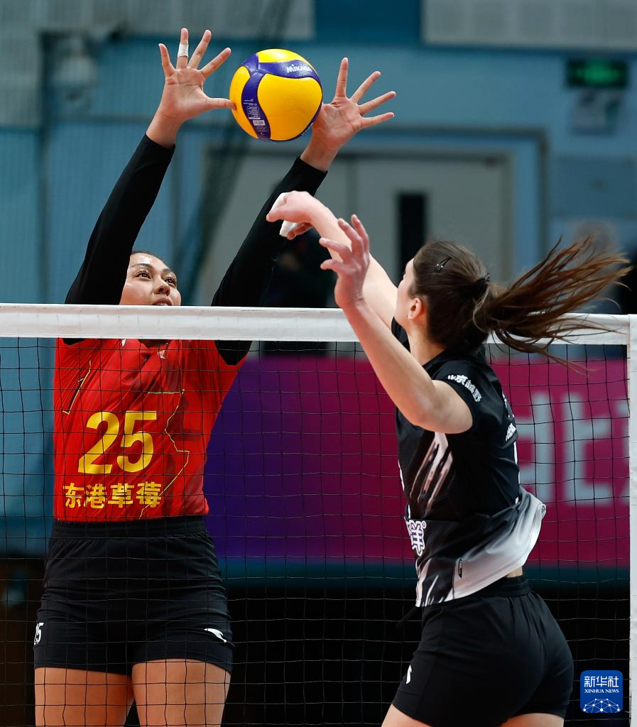 1月6日,辽宁东港草莓队球员阿多拉·阿奈(左)在比赛中拦网。