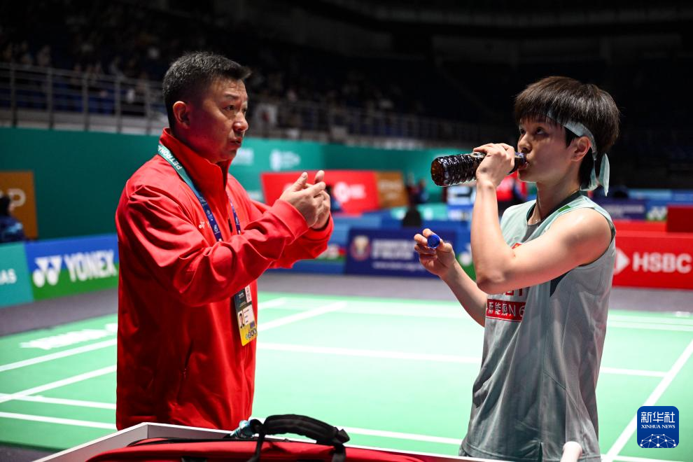 1月7日,王祉怡(右)在比赛间隙接受教练罗毅刚指导。